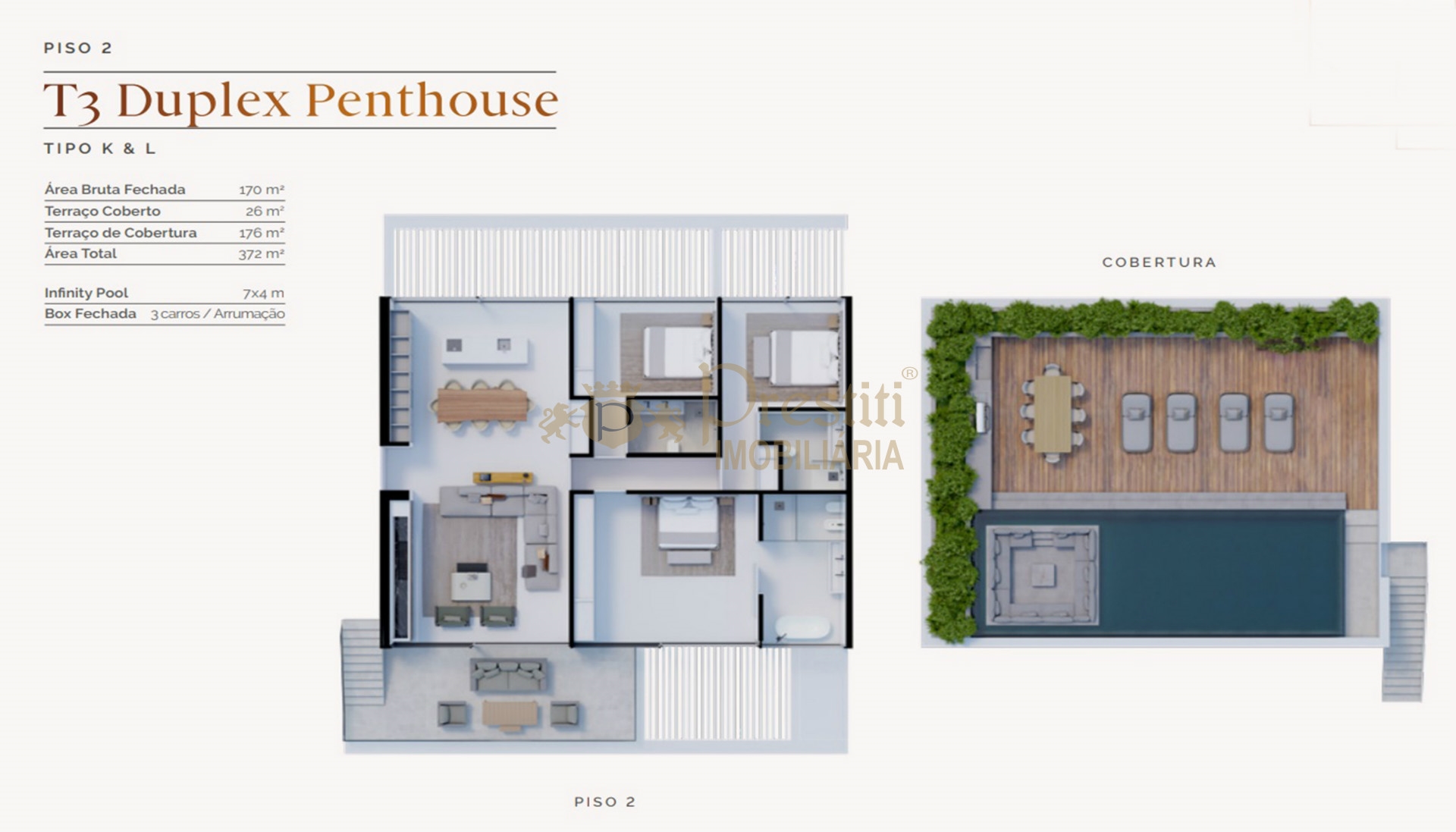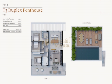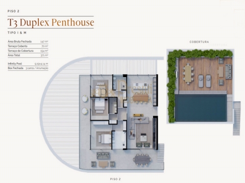 - No 2º piso (duplex penthouse) dispõem também de excelentes varandas em frente à sala e acesso à cobertura, onde cada apartamento tem o seu terraço e piscina privativa tipo infinito, esta entre os 8 e os 11 metros de comprimento, dependendo da tipologia e localização, bem como uma zona de lounge com um conjunto de sofás, uma zona de refeições, uma bancada com barbecue, bar, e ainda uma zona para as espreguiçadeiras.