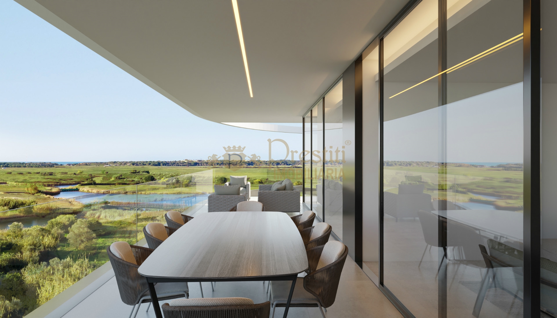 - No 1º piso apresentam varandas igualmente generosas, onde está projetada uma zona de estar com um conjunto de sofás e mesa de centro, assim como um conjunto de sala de jantar exterior, beneficiando de vistas sobre o próprio empreendimento, campos de golfe e o mar ao fundo.